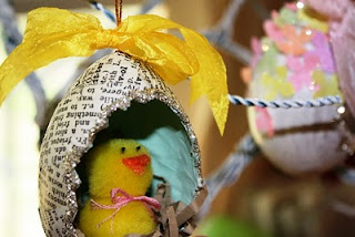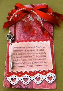 On my tag, I combined both the color and the season. I Cuttlebugged the tag and then inked it aqua (Broken China Distress Ink - love that color!). The ruffles are two layers of gathered Melissa Frances crepe paper topped with a scalloped strip of paper. I laid a piece of Wonder Film (thin double-sided adhesive sheet) over the vintage Easter postcard image and covered it with fine clear glitter. I placed this over a piece of vintage crocheted lace along with some velvet ribbon, paper flowers and a paper rose misted with Shimmerz. The butterfly was punched out of book text and the stamp is a recent Michael's $1 spot purchase.